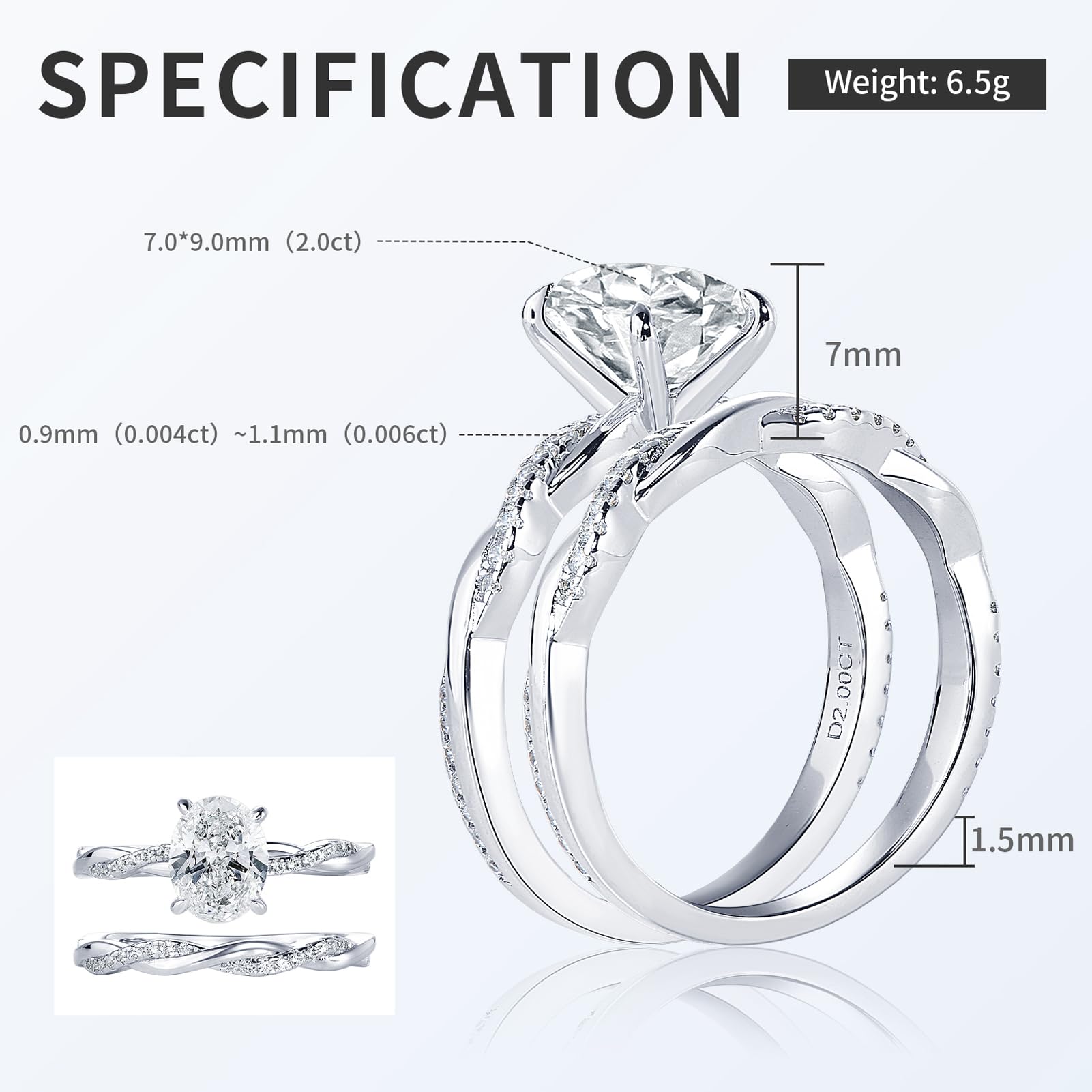 - Specification: Handinlaid 2.0ct(9x7mm) oval cut D color VVS1 clarity with high quality excellent cut moissanite, side stone with cubic zirconia, lead-free and nickel-free, hypoallergenic. The MOISSANITE 100% PASS THE DIAMOND TESTER to the highest point.